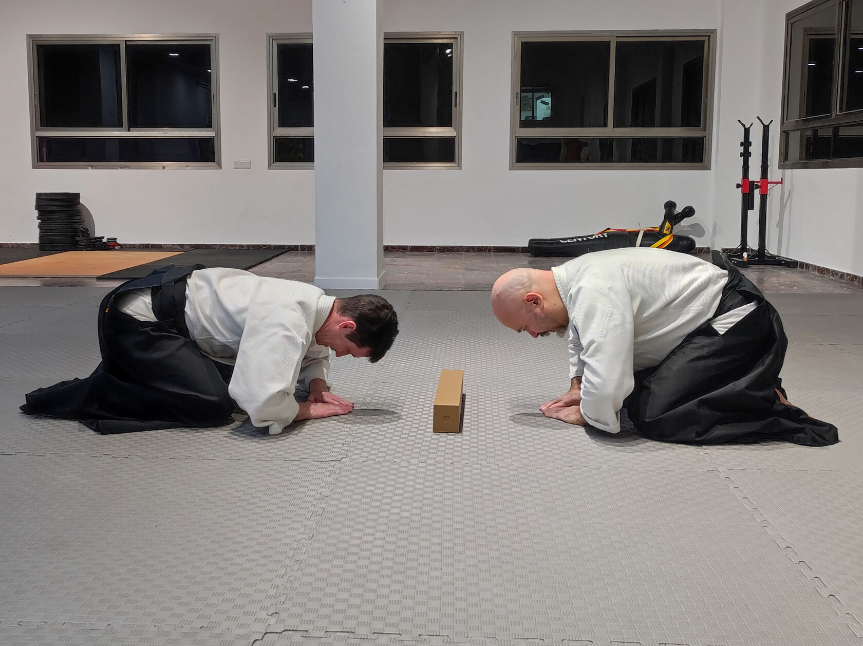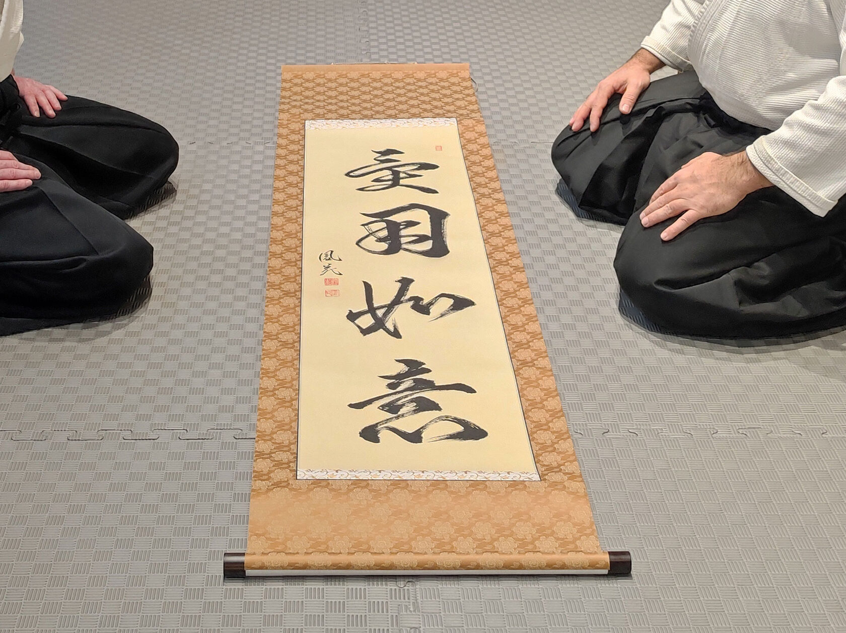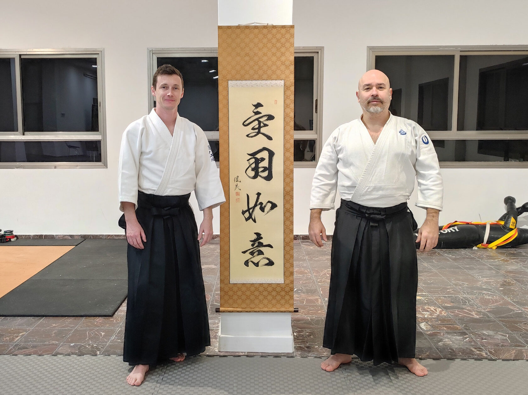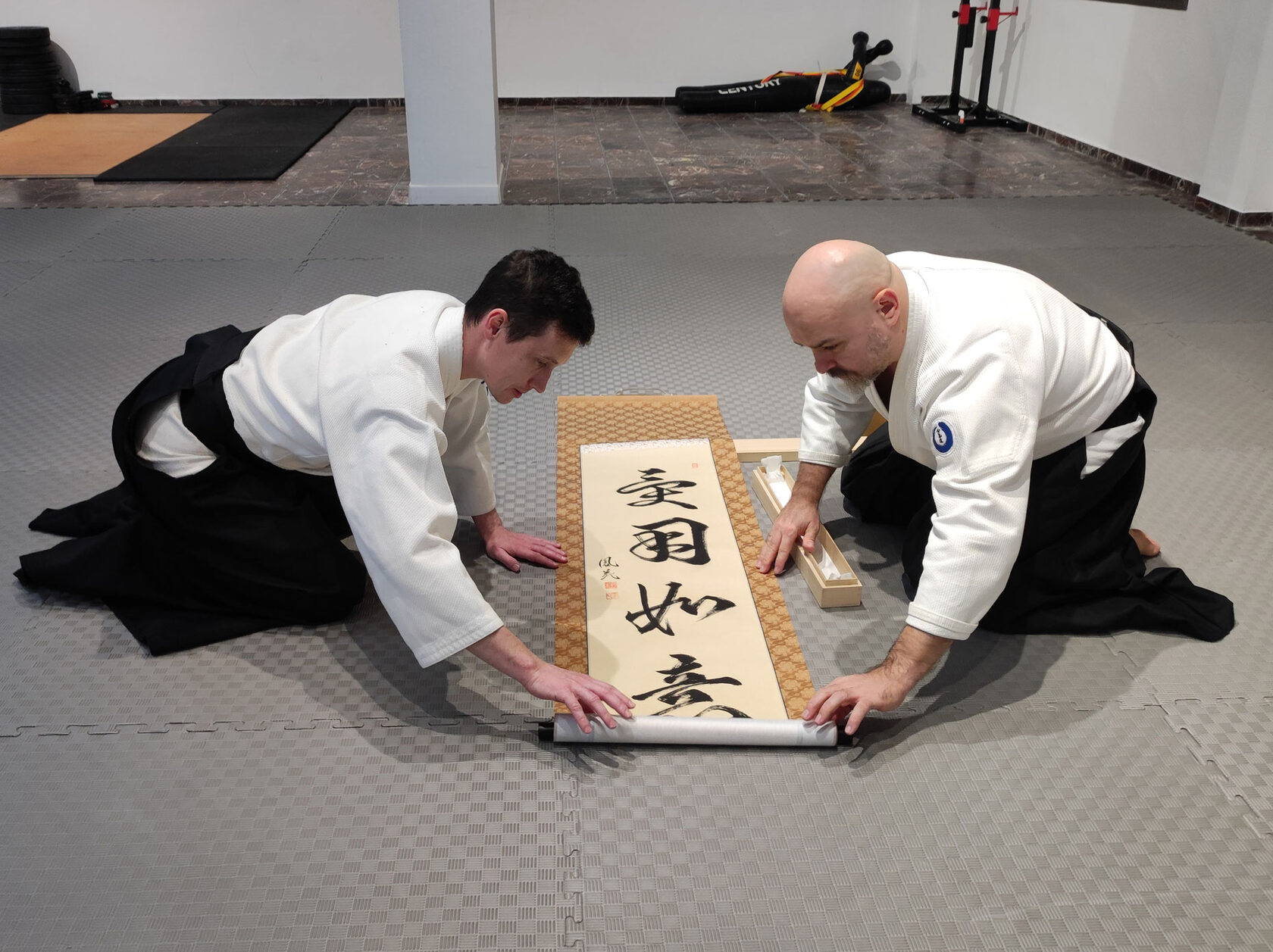 A significant event recently took place at our dojo — we received a new shōmen. This authentic scroll, with an intricate history, was specially written for us by the renowned Japanese calligraphy master, Nomura Shōheishi. We express our immense gratitude to Nomura Sensei for this beautiful scroll, which will now inspire me and my students in our budo practice. And I sincerely hope that in the future, I will have the chance to practice budo together with Nomura Sensei, who is also a budo master.